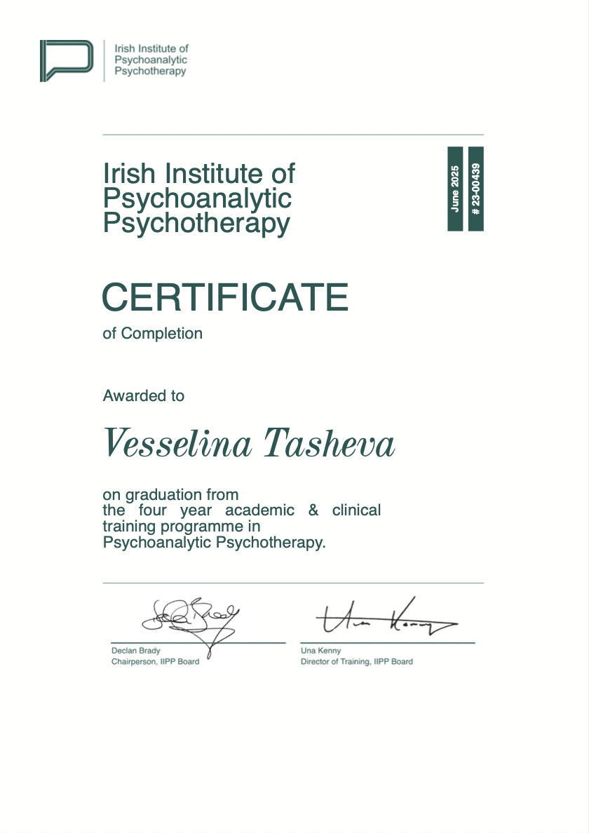 4-year diploma from the Irish Institute of Psychoanalytic Psychotherapy