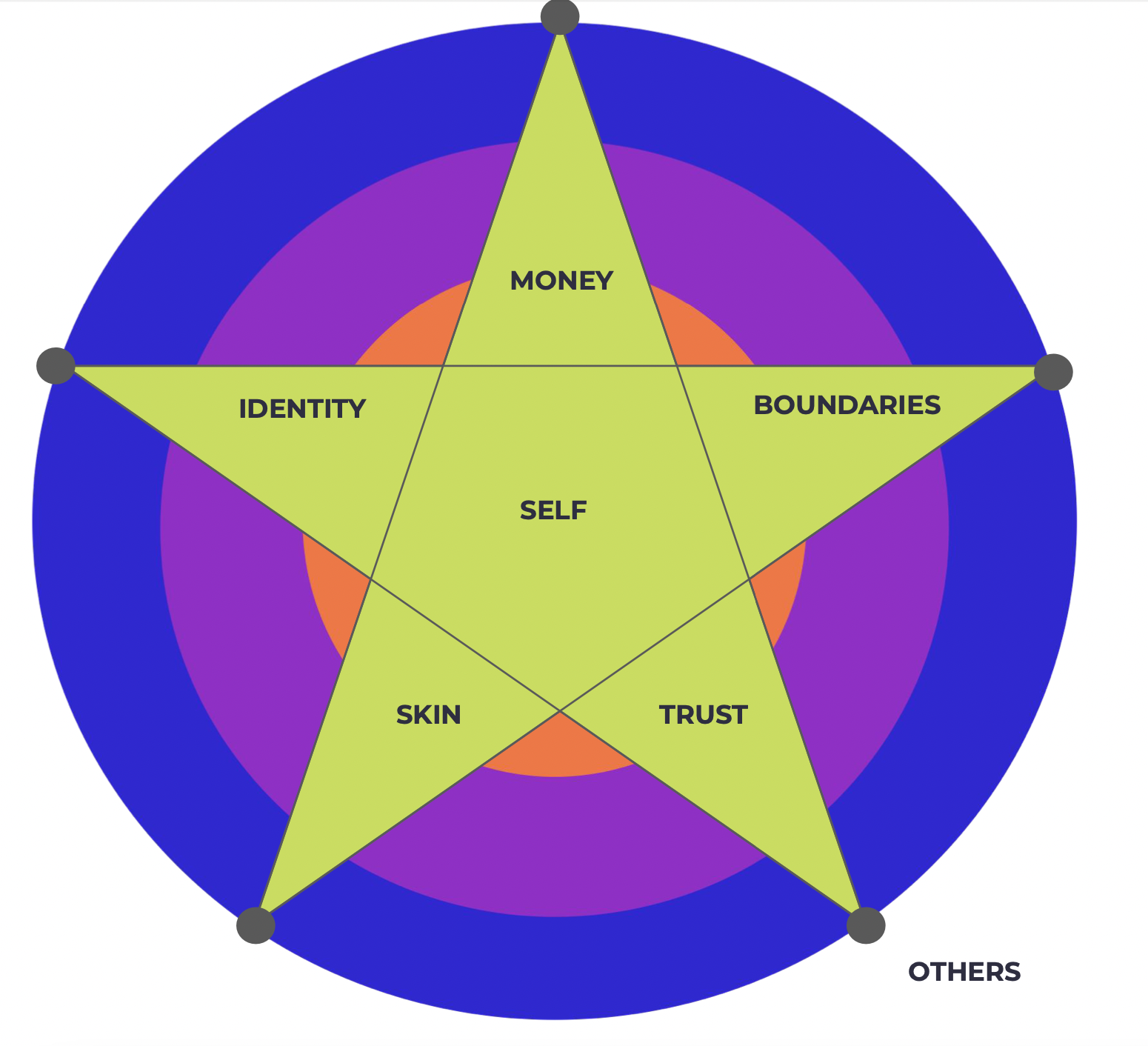 The STAR illustrates the connection between Self and Others and the key points of interaction - through identity, money, boundaries, skin, and trust.